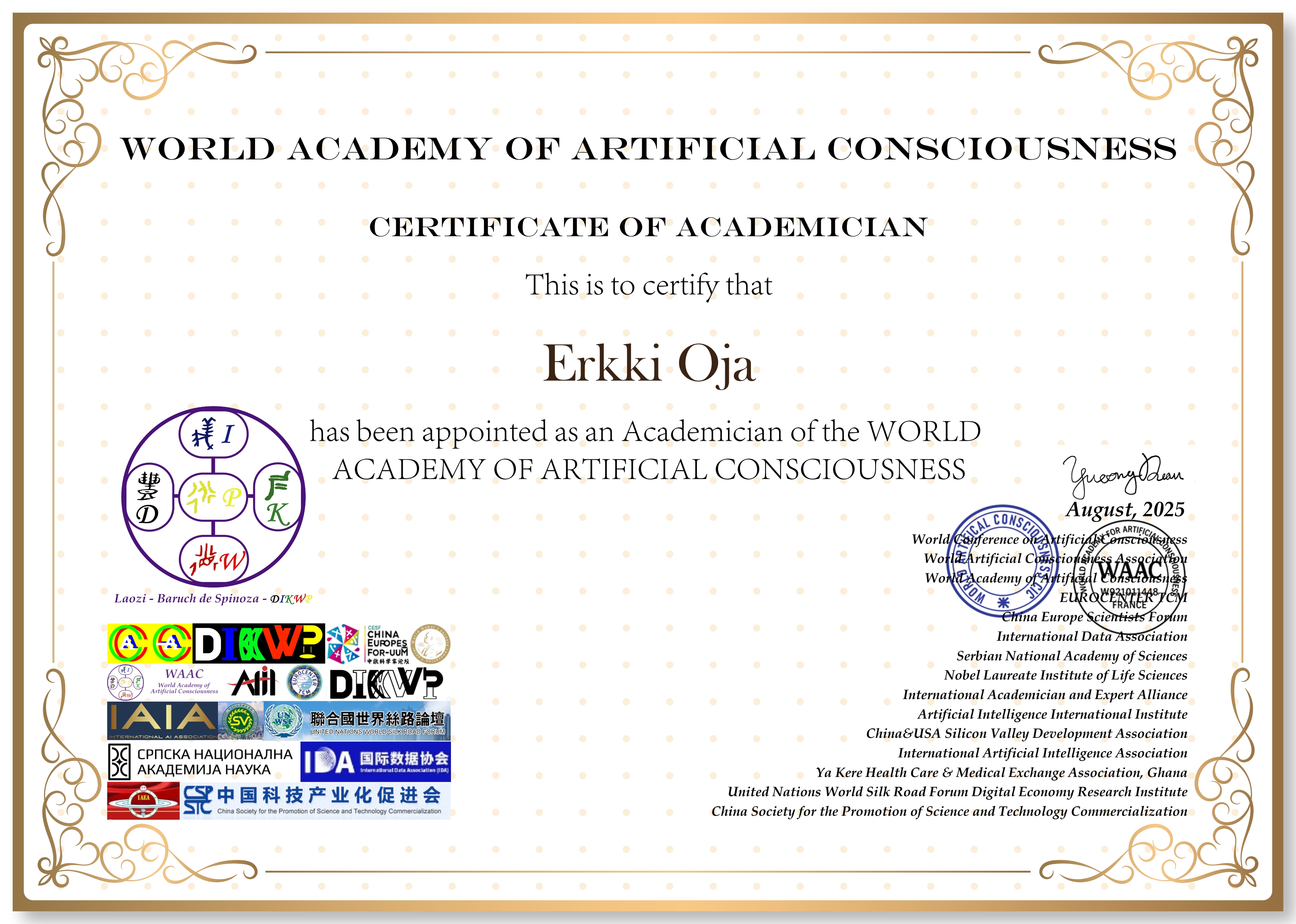 We are pleased to announce that Professor Erkki Oja, a professor in the Department of Computer Science and Engineering at Aalto University and recipient of the IEEE Neural Networks Pioneer Award, has been honored with the title of academician of the World Academy of Artificial Consciousness (WAAC) for his groundbreaking research in independent component analysis (ICA) and Hebbian learning rules.