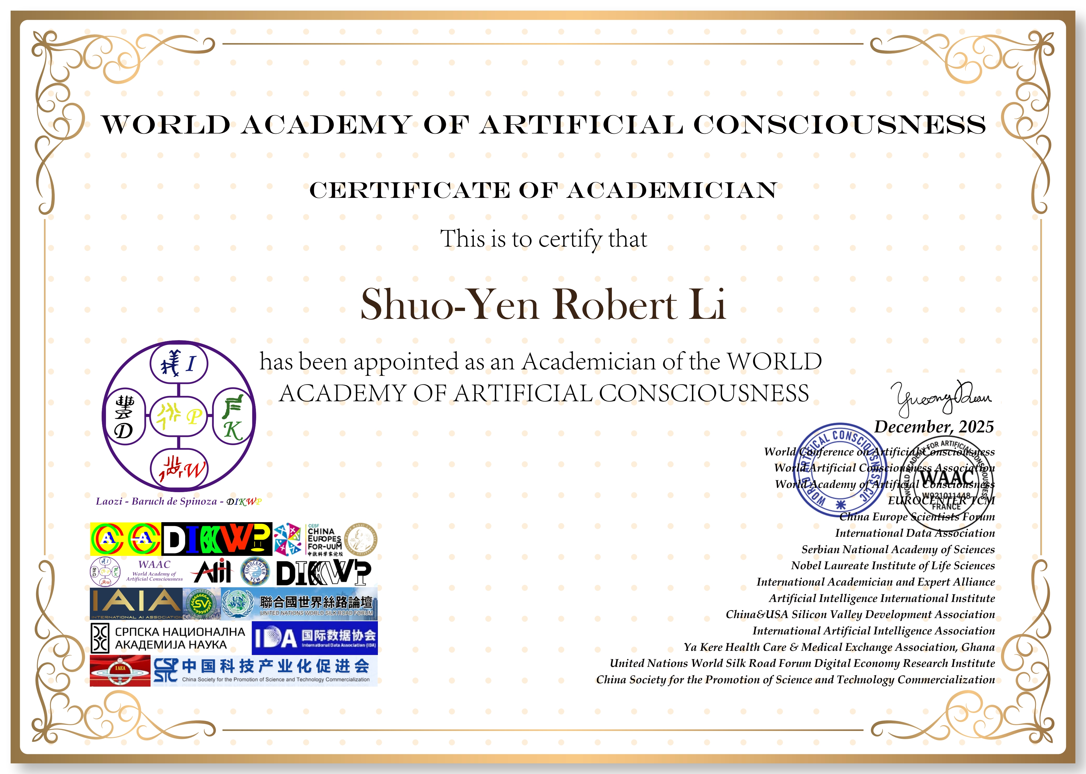 We are pleased to announce that Professor Shuo-Yen Robert Li, Director of the Li Institute of Mathematical Technology and Distinguished University Professor at the University of Electronic Science and Technology of China (UESTC), Emeritus Professor in the Department of Information Engineering at The Chinese University of Hong Kong (CUHK), Academician of the National Academy for Artificial Intelligence (NAAI), and IEEE Life Fellow, has been elected Academician of the World Academy for Artificial Consciousness (WAAC) in recognition of his outstanding impact on the fundamental theories of information and intelligence.