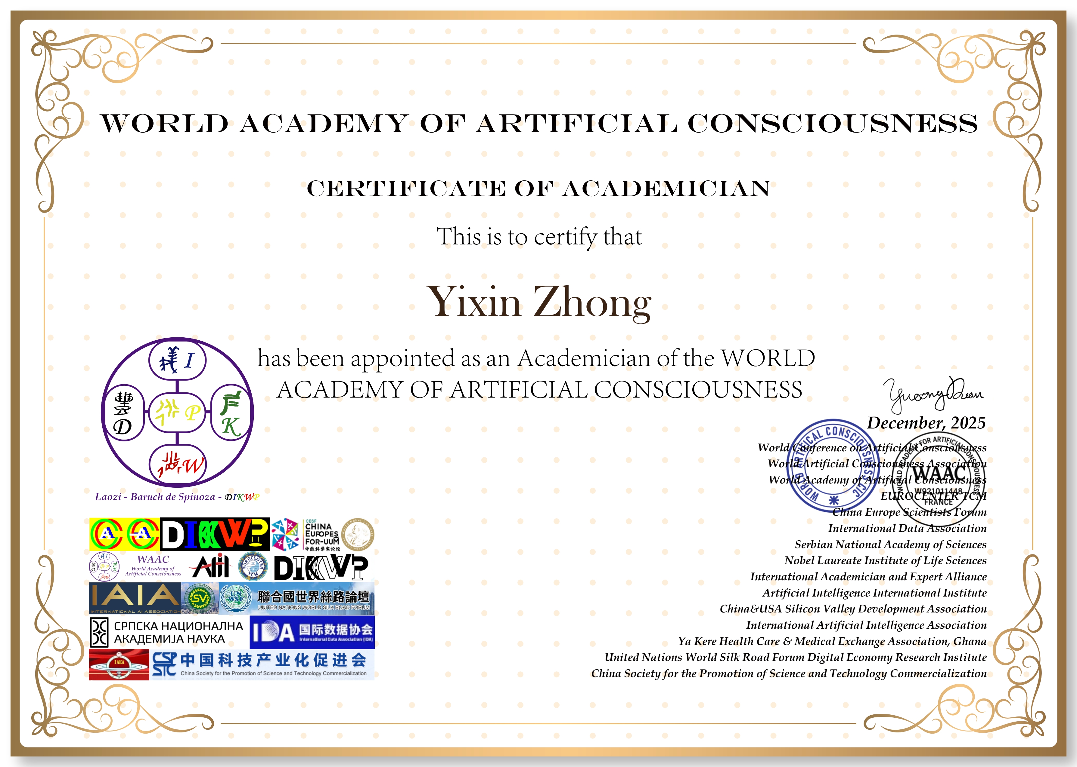 We are pleased to announce that Professor Yixin Zhong, Professor at the Center for Intelligent Science and Technology at Beijing University of Posts and Telecommunications (BUPT) and former Vice President of BUPT—who has also served as the inaugural Chief Expert for the Communications theme under China’s National High-Tech R&D Program (Program 863) and as former President of the Chinese Association for Artificial Intelligence (CAAI)—has been elected a Academician of the World Academy for Artificial Consciousness (WAAC) in recognition of his pioneering contributions to foundational information science and methodologies for general artificial intelligence.