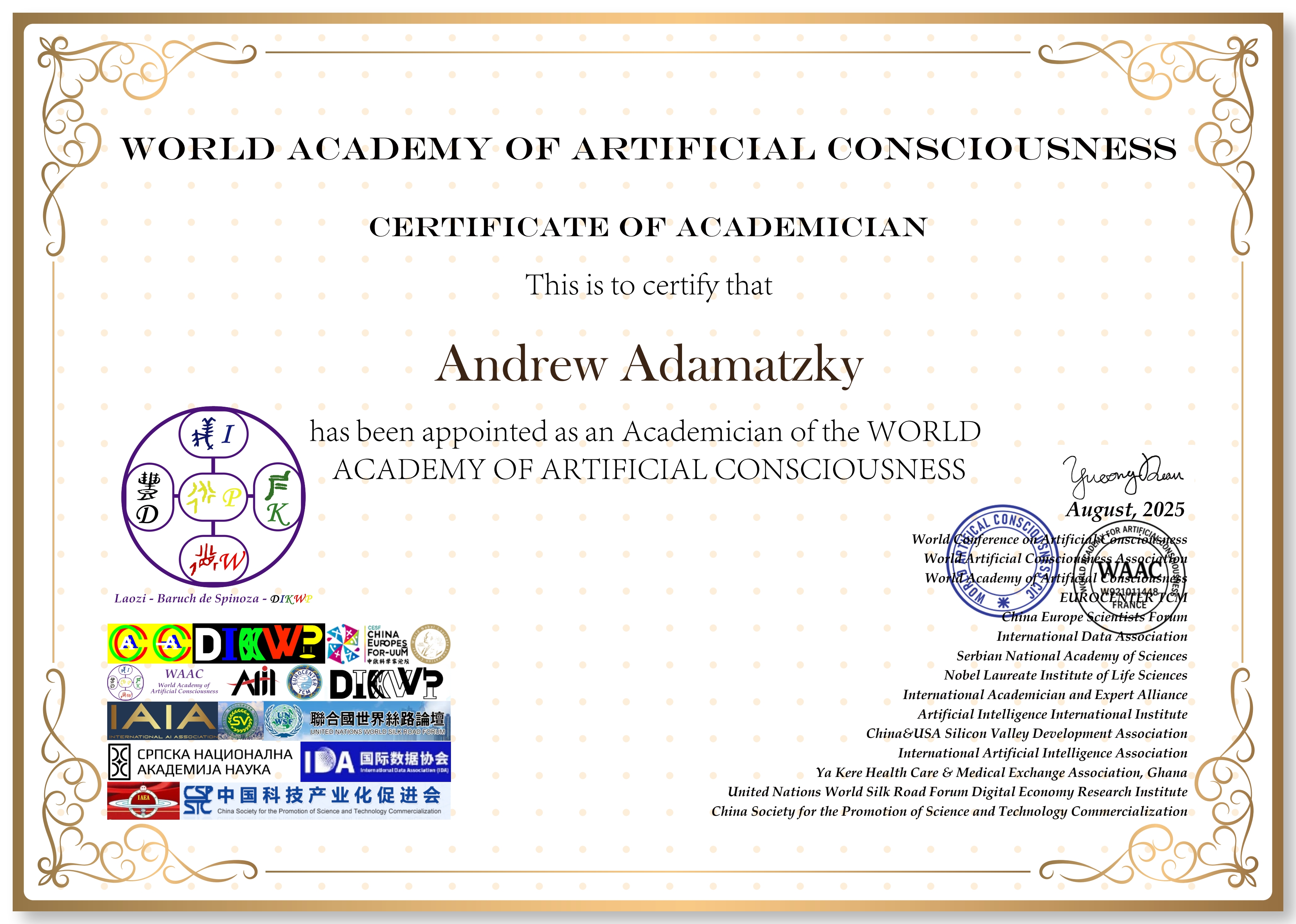 We are pleased to announce that Andrew Adamatzky—Professor in the Faculty of Computer Science and Creative Technologies at UWE Bristol and Director of the Unconventional Computing Laboratory—has been elected an Academician of the World Academy for Artificial Consciousness (WAAC), in recognition of his pioneering work in unconventional computing, slime mould/fungal computing, and reaction–diffusion computing, as well as his sustained exploration of and insightful contributions to the search for computational markers of consciousness.
